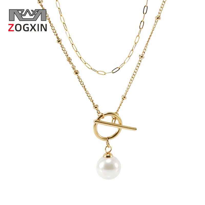 Titanium Steel Double Layer Pearl Necklace Gold Stainless Steel fashion OT Buckle Round Pearl Pendant Necklace Female