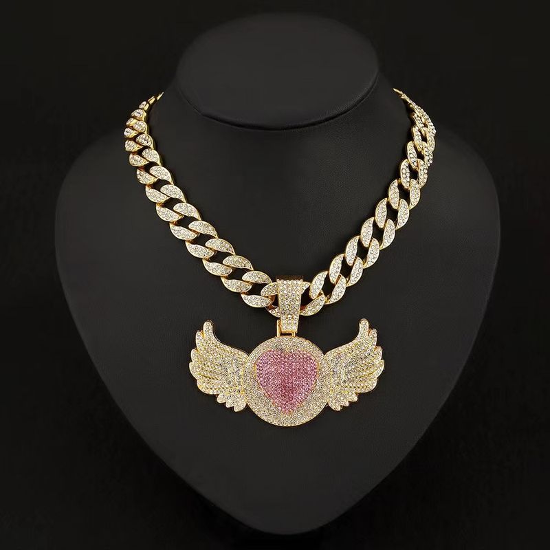 Hip hop rap trendy creative pink diamond love angel wing pendant necklace pink diamond love men's necklace