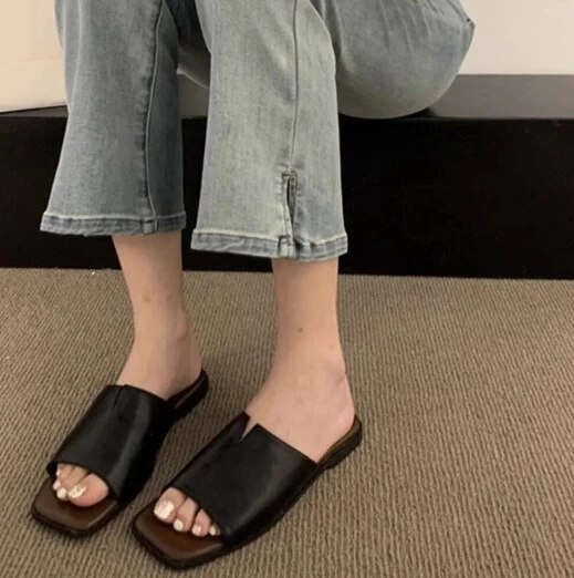 Home Anti slip Soft Leather 2024 New Sandals One line Summer Fashion Versatile Flat Bottom Soft Sole External Wearing Slippers