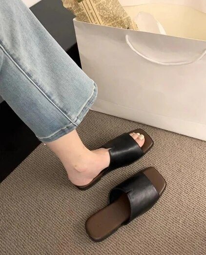Home Anti slip Soft Leather 2024 New Sandals One line Summer Fashion Versatile Flat Bottom Soft Sole External Wearing Slippers