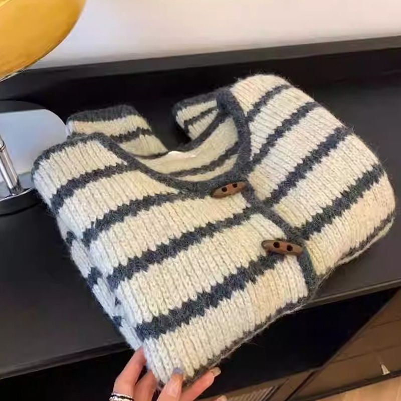 European Style Striped Knitted Cardigan for Women, Autumn and Winter, Lazy Style, Horn Button V-Neck, Loose Short Sweater Cardigan