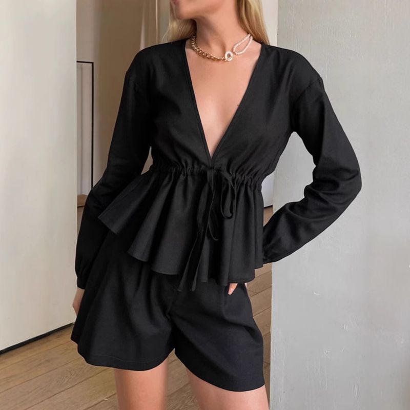 Completo da donna in due pezzi, stile casual per le vacanze estive 2025, in cotone e lino nero, con top a maniche lunghe e pantaloncini.