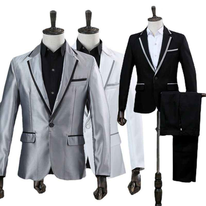Completo da esibizione per presentatore da uomo CT, completo a maniche lunghe, completo da cantante di scena, abito nero, bianco, oro e argento.