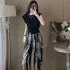 European Style High-End Casual Fashion for Women Summer Slimming Black Short Sleeve Wide-Leg Pants Two-Piece Set