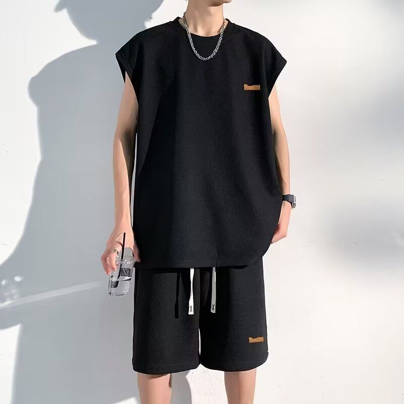 Completo estivo senza maniche in seta ghiacciata, canotta, maglietta e pantaloncini alla moda, un completo di abbinamento accattivante con gli uomini