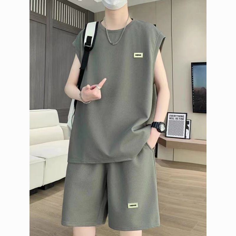 Completo sportivo casual da uomo in due pezzi, senza maniche, estivo, in seta ghiacciata, con pantaloncini larghi e gilet_voghion.com