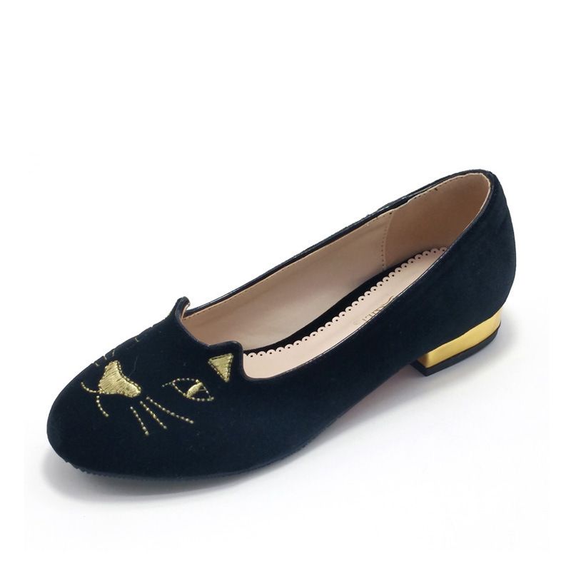 Confezione completa di scarpe basse casual da donna con punta tonda, nuove primaverili, in pelle scamosciata dorata, con testa di gatto ricamata, versione alta