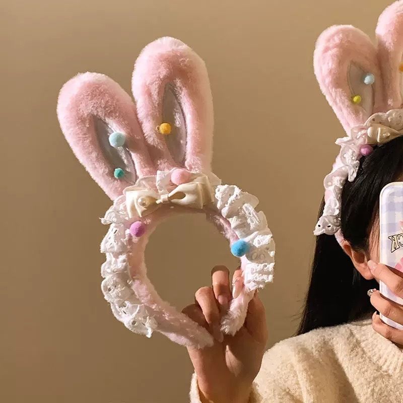 Strawberry Jade Rabbit Cute Pink Bunny Ears Lace Plush Headband for Women Face Washing Makeup Photography Hair Accessories Headband Autumn Winter