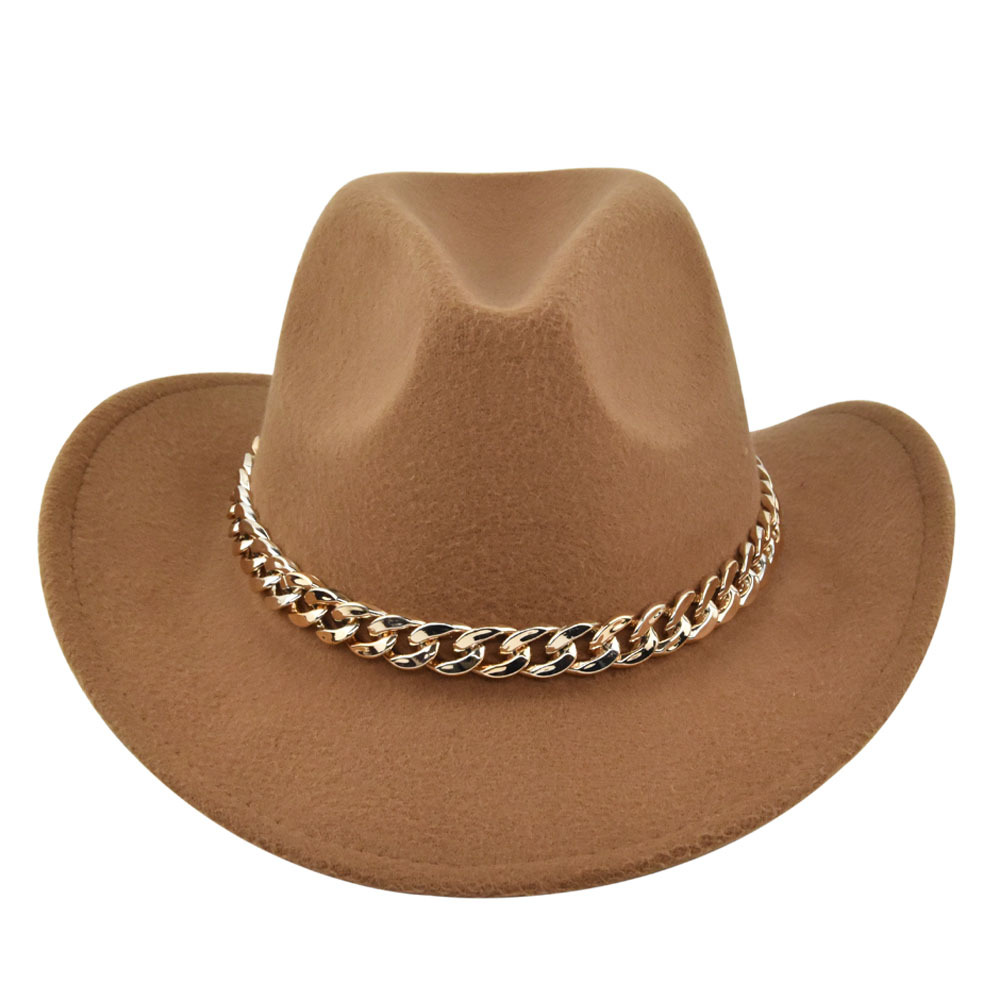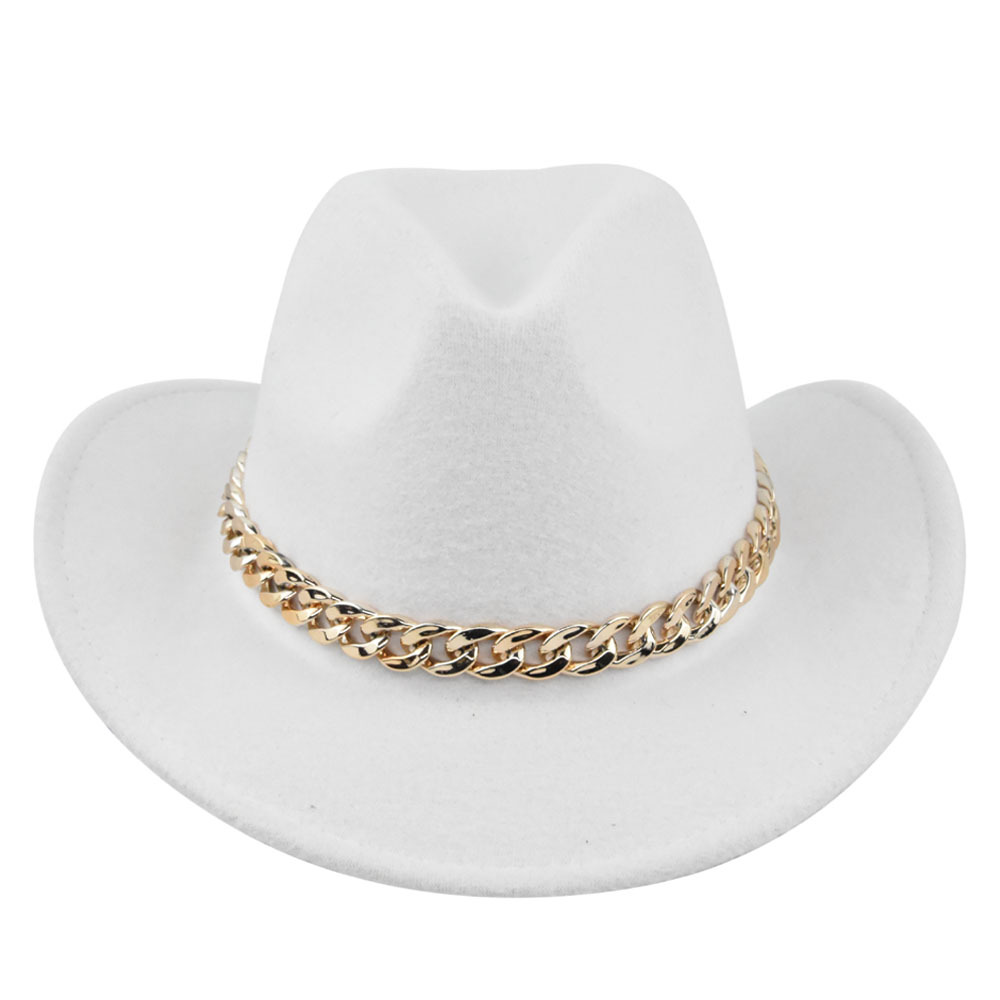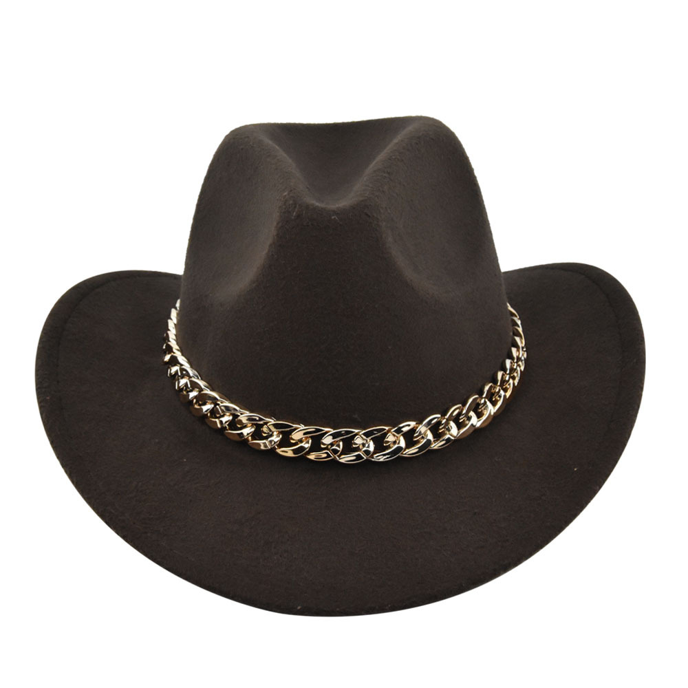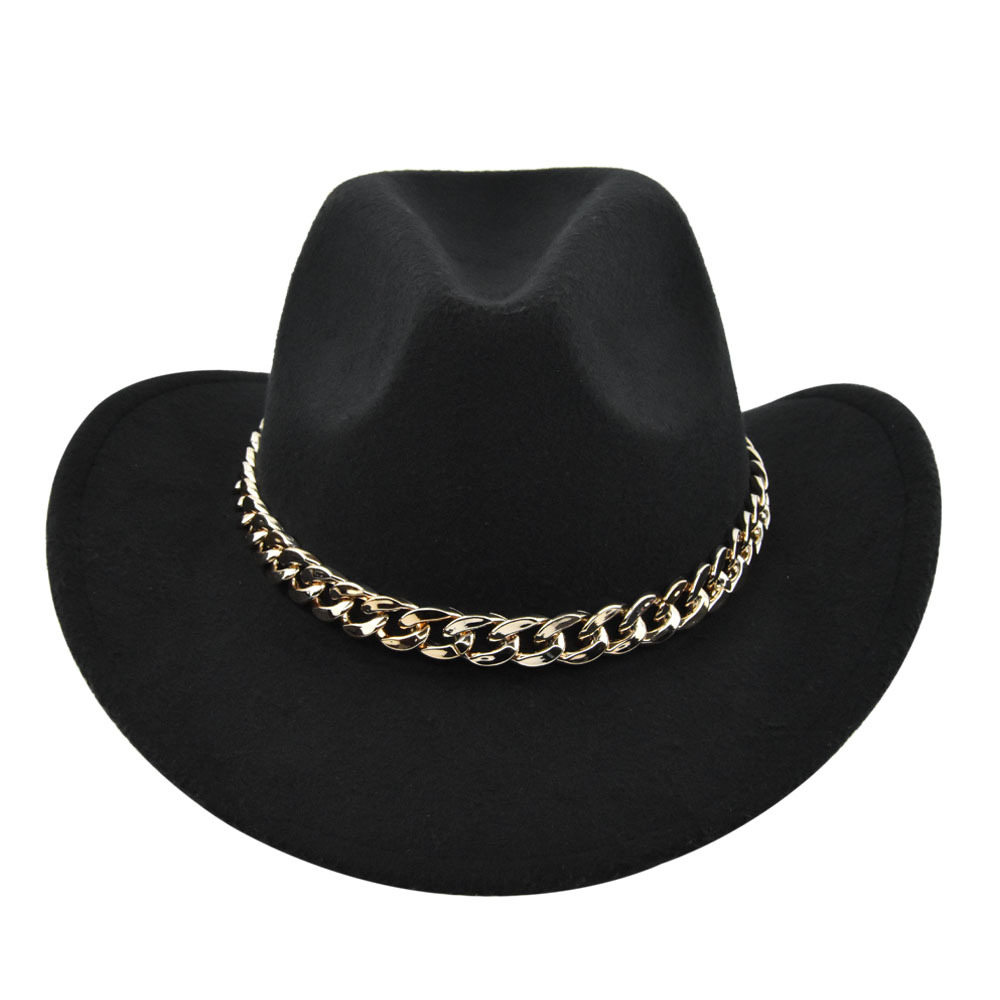 Cappello da cowboy jazz in feltro di lana con catena placcata in oro, cappello da cowboy
