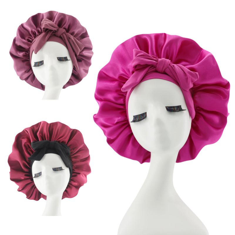 Cuffia da notte in raso con tesa larga elastica, con fascia per capelli con fiocco e nastro, per la protezione dei capelli da donna