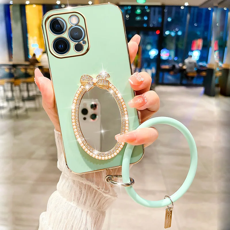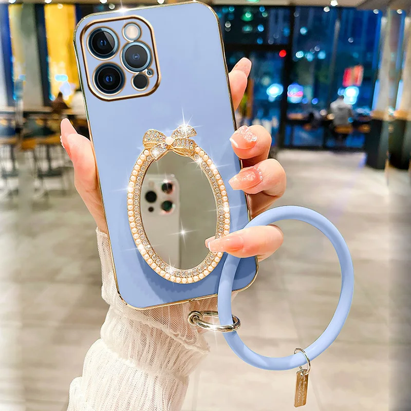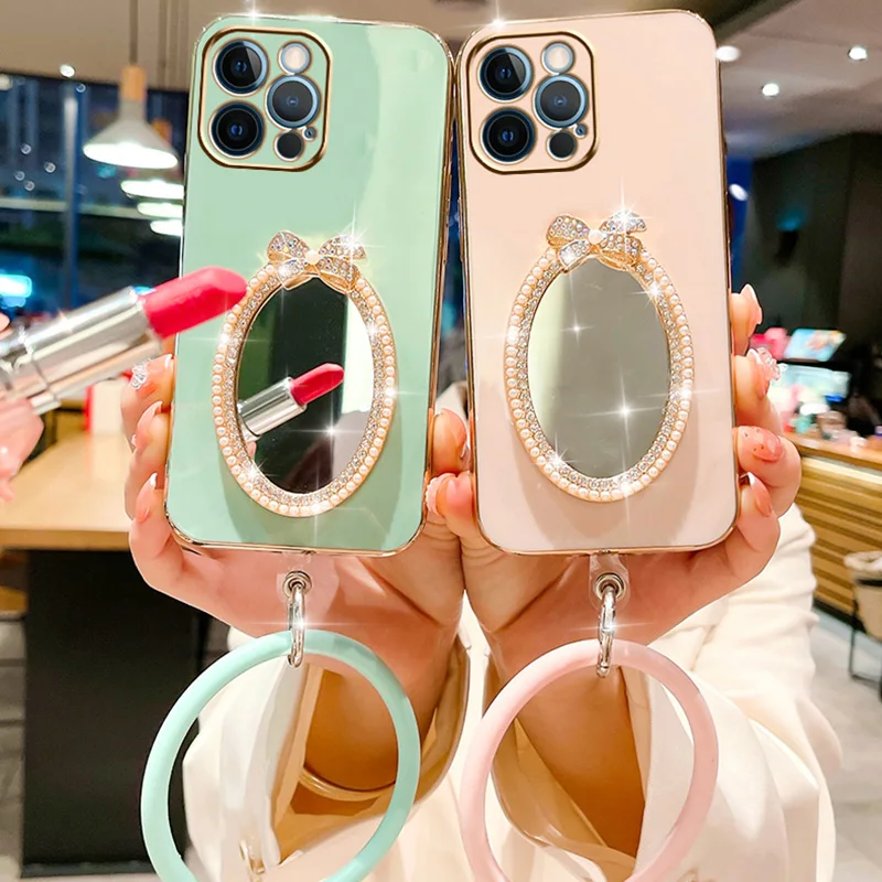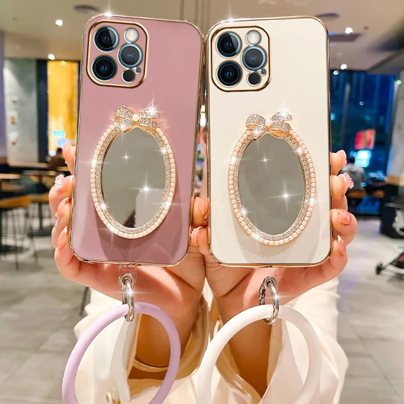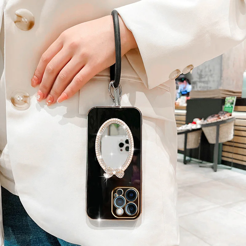 Makeup Oval Mirror Case For Vivo Y21 V20 Y55 5G V21 Y73 V23 Y22 V23E Y15S Y35 V25 Y33S V25E Y55 Y75 5G Wristband Bracelet Cover