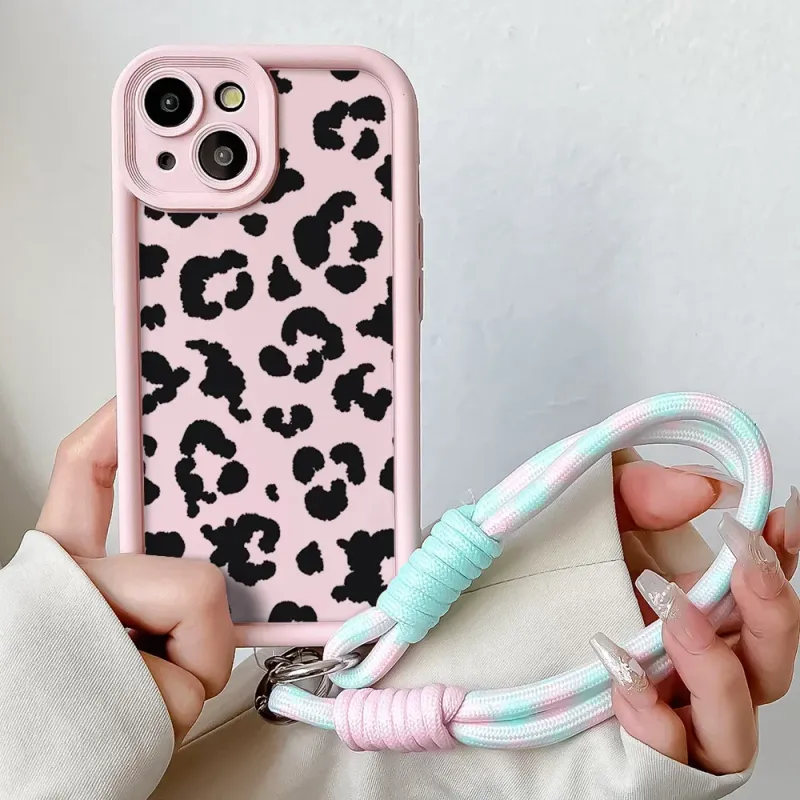 Custodia con cordino da polso con catena per Xiaomi 14T 15 13t Poco F6 M6 Pro Redmi 14C Note 14 Pro Plus Custodia per telefono leopardata rosa