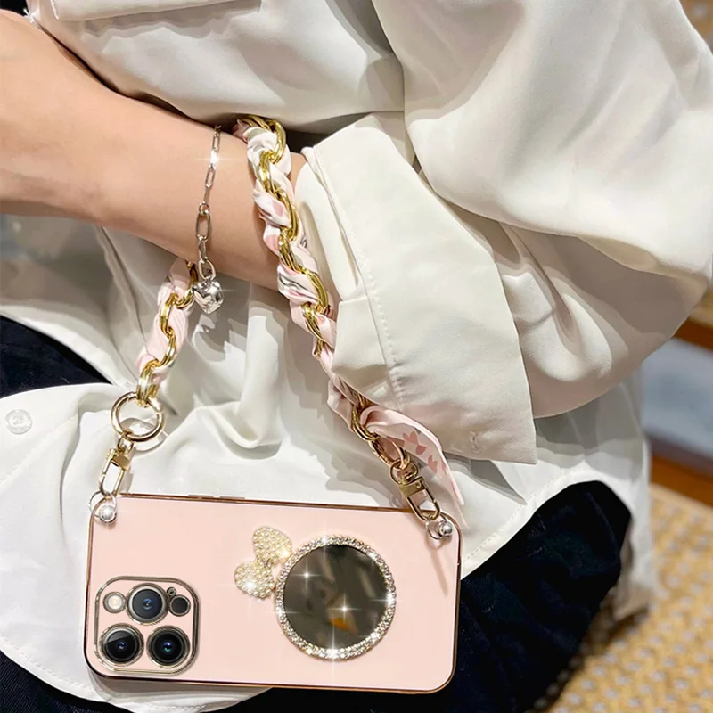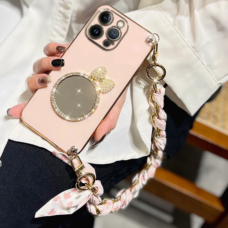 Silk Lanyard Wristband Bracelet Case For Redmi Note 13 Pro Plus 12 12S 12C 11 11S 10 10S 9 9S 9A 9C Pro Bow Mirror Plating Cover