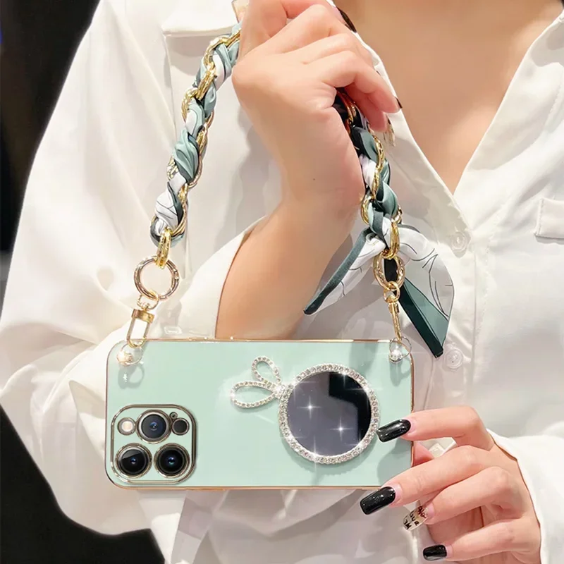 Cute Rabbit Makeup Mirror Silk Lanyard Wristband Case For iPhone 15 15 Pro Max 15 Plus 13mini 14 13 12 11 Pro Max Plating Cover