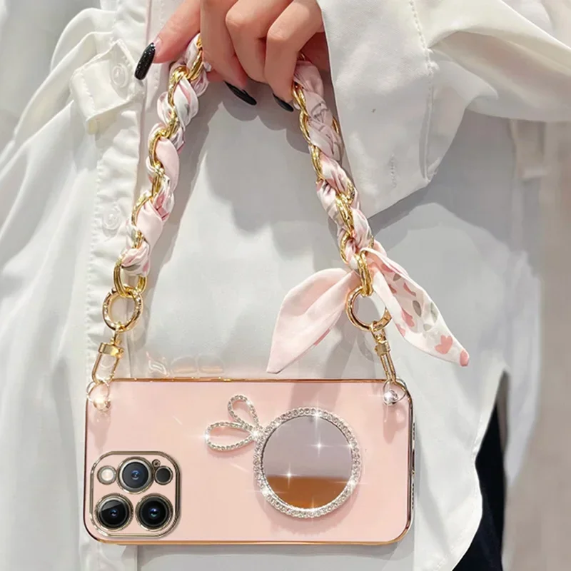 Custodia per cinturino con cordino in seta per specchio per il trucco simpatico coniglio per iPhone 15 Plus 13mini 14 13 12 11 Pro Max Cover placcatura