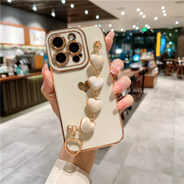 For iPhone 15 Pro Max Square Plating Frame Heart Bracelet Strap Phone Case For iPhone 11 12 13 14 15 Xs Xr 7 8 Plus Chain Cover
