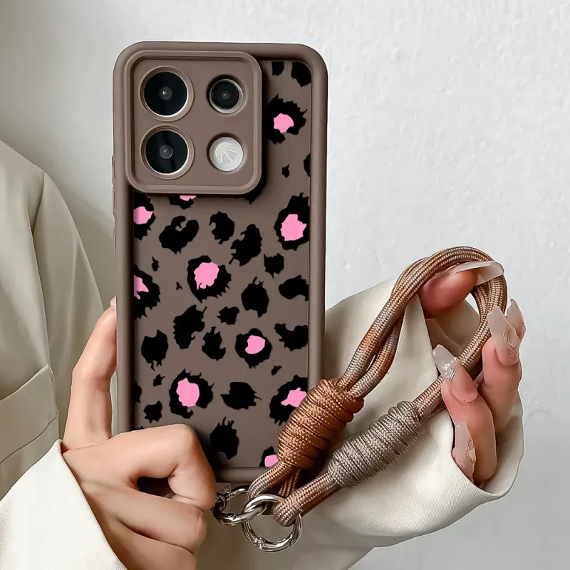 Custodia per telefono con stampa leopardata per Xiaomi Poco X7 Pro Redmi Note 14 Pro con cordino da polso e cinturino in morbido silicone