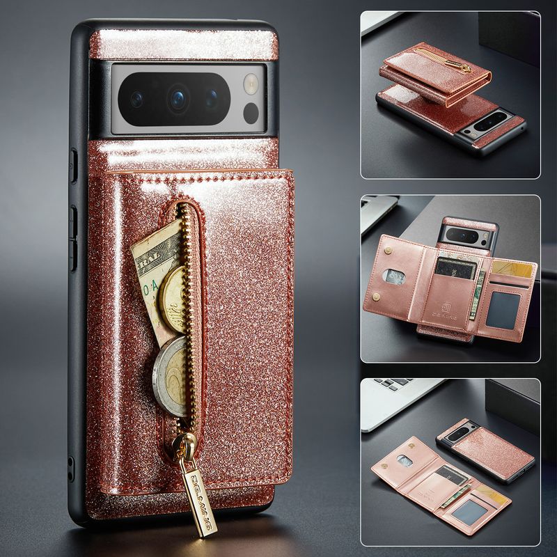 Custodia protettiva con cerniera e portafoglio M3 per Google Pixel 8 Pro, con custodia magnetica e glitter per carte di credito e telefono.