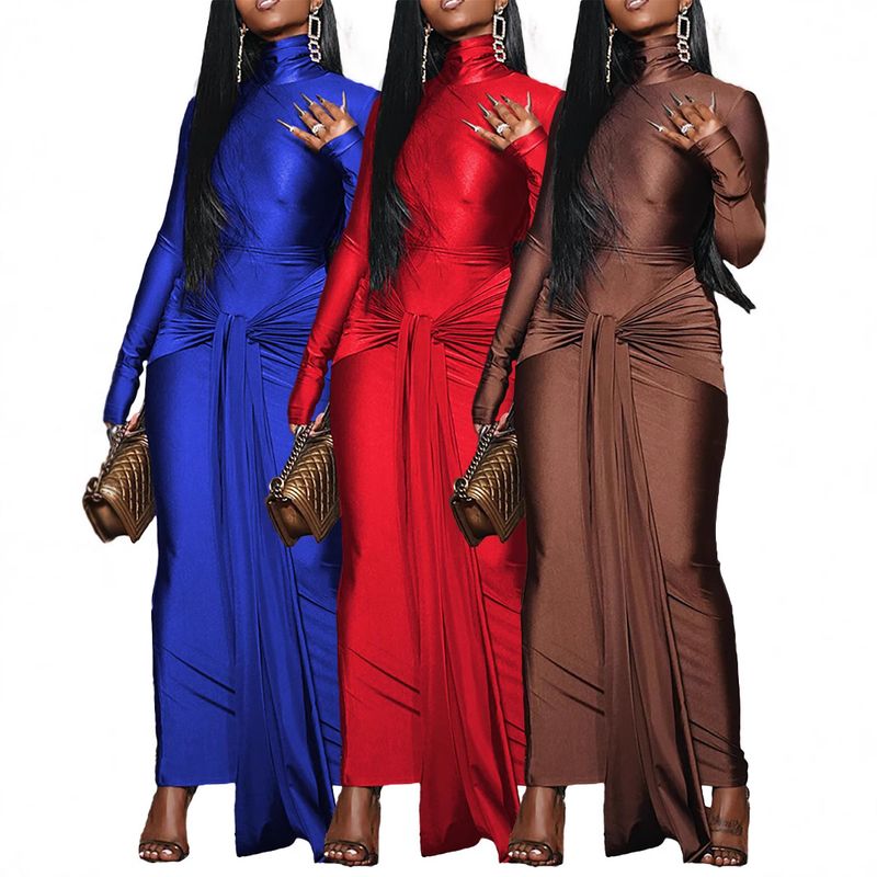 D8651 Abito con cintura e collo alto alla moda, gonna lunga in saldo
