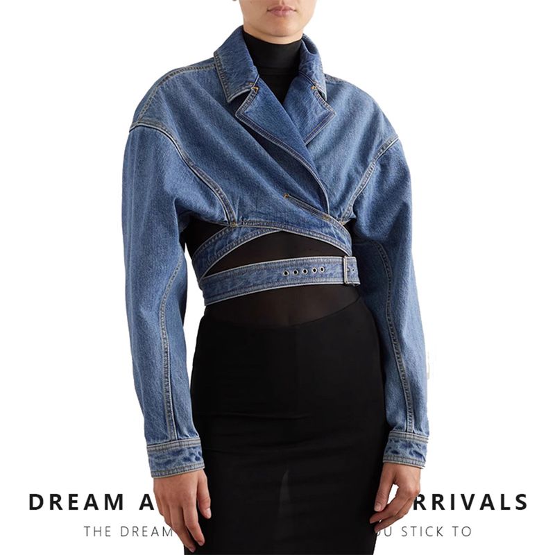Design Sense Top Coat con revers incrociati, cintura in vita traforata, giacca corta in denim da donna