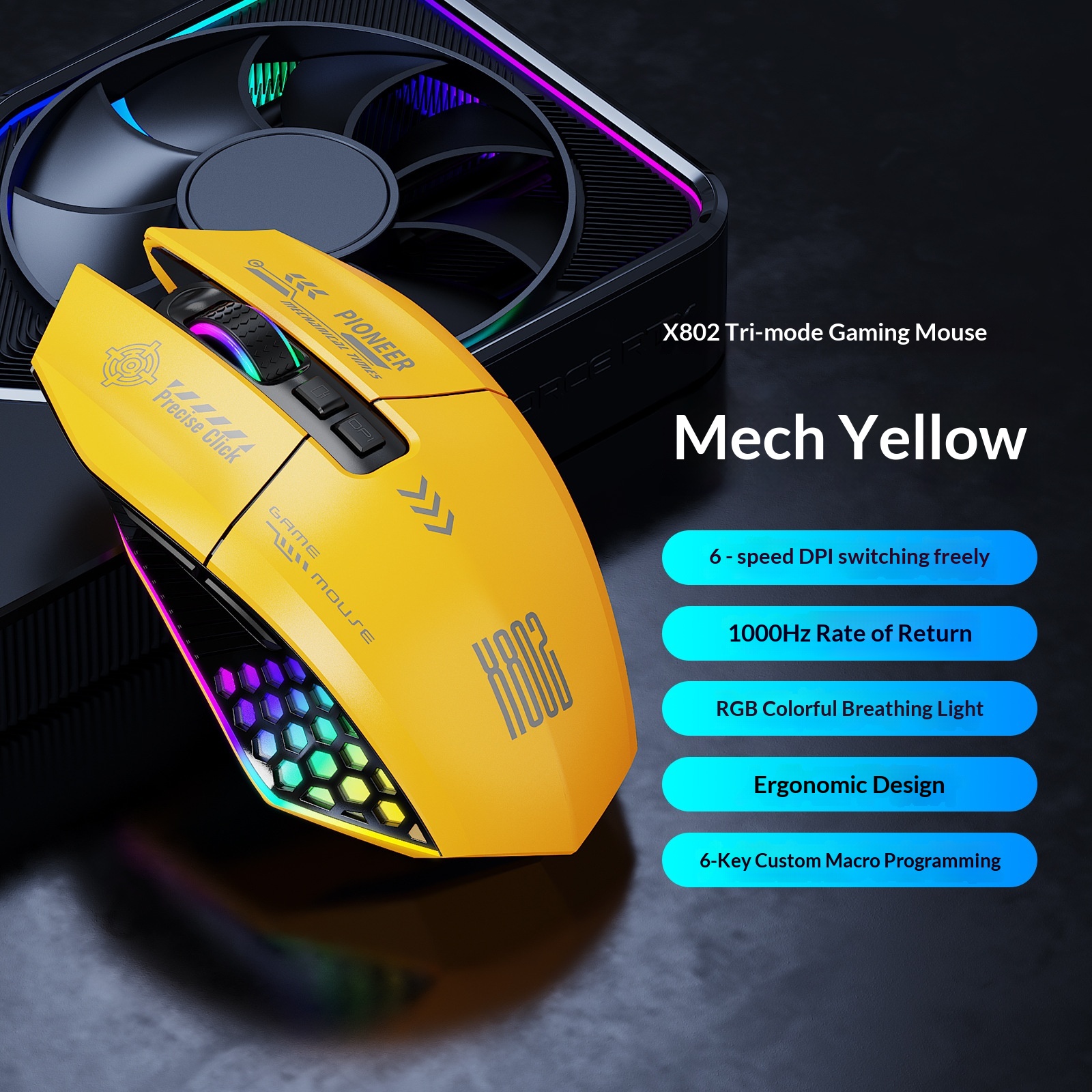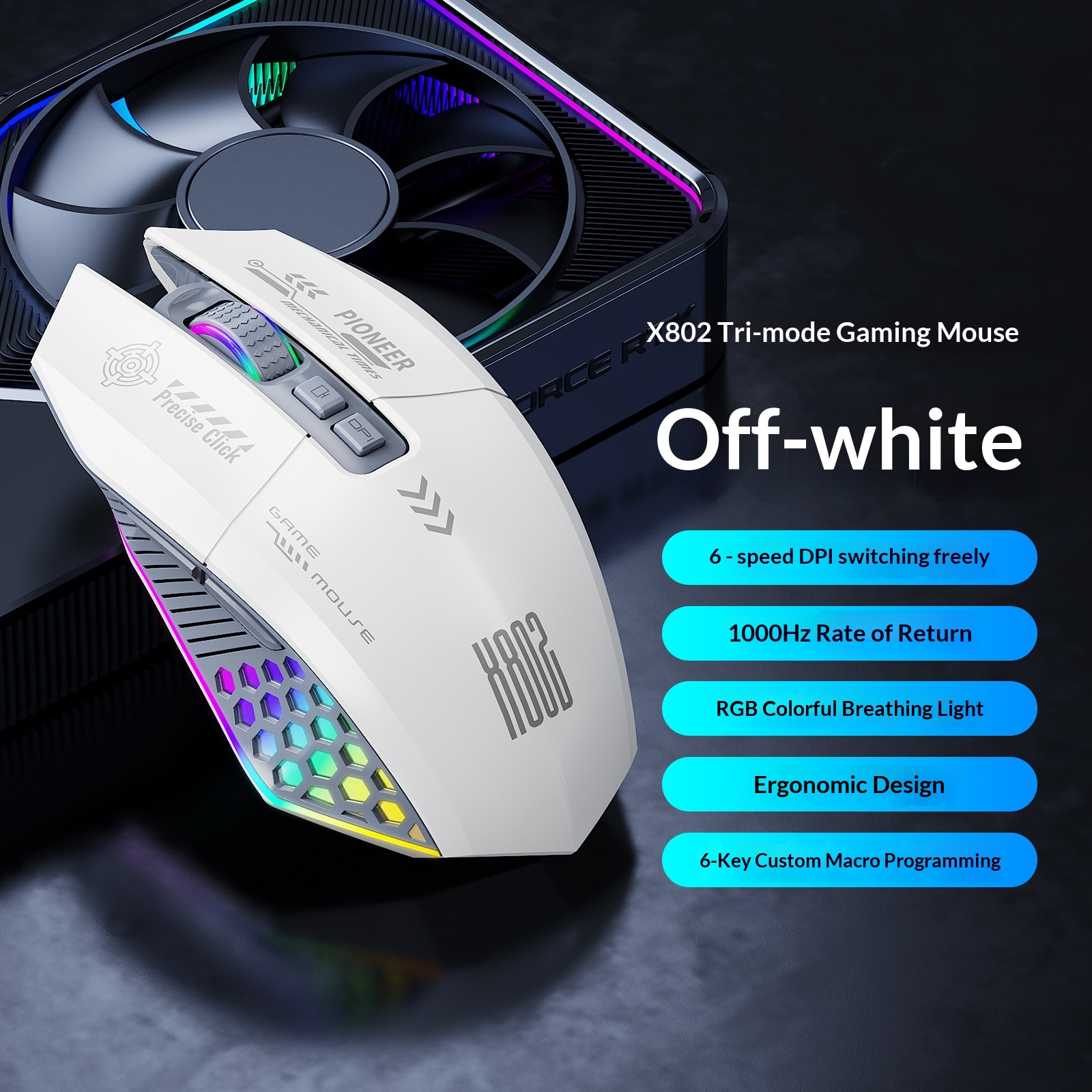 Brand:FMOUSE/Tiger Cat,Item Number:X802,Time to market:2025.3.1,Type:Gaming Mouse,Mouse size:Rat ≥120mm,Connection method with a computer:Wired + Bluetooth,Compatible Models:Desktop Computer,Optical resolution:12800,Number of Buttons:7,Interface:USB,Wireless Transmission Frequency:2.4GHz,Does it support ergonomic design?:Support,Adjustable resolution:Six-speed,Operating distance:10m,working method:Optical,Direction of the scroll wheel:Four-way roller,Long cable length:1.5,Product Dimensions:132*72*43,Product weight:0.091,Custom Printing:Sure,After-sales service:Storefront Three Guarantees,Package contents list:Contact customer service,Color:Blue-white, off-white, mech yellow,We have authorized private labels available:yes,Is it exclusively for cross-border export supply?:No,Customizable:Support,Is it a patented source product?:No,Power supply mode:Comes with a charger