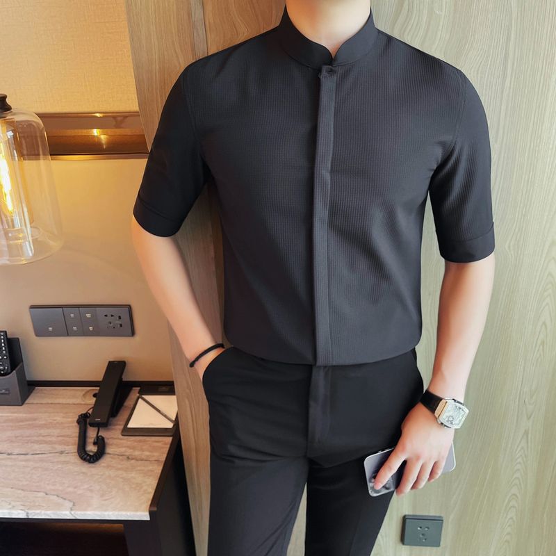 Douyin fornisce camicie da uomo a maniche lunghe, slim fit, con colletto alto, a maniche lunghe, con bottoni nascosti, nuove camicie estive.