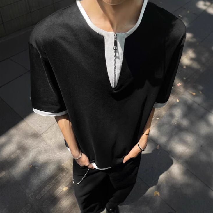 Two round neck metal zipper high street contrasting splicing short sleeved solid color T-shirts for summer vacation in 2025