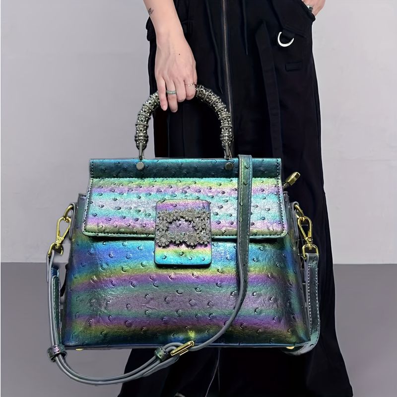 Women's Elegant Pea Blue Ostrich-Textured Synthetic Leather Handbag with Detachable Shoulder Strap, Magnetic Closure & Golden-Tone Hardware - Versatile Crossbody/Shoulder Bag for Casual & Formal Ocns, Purse Shoulder Bag, Sparkling Embellishments