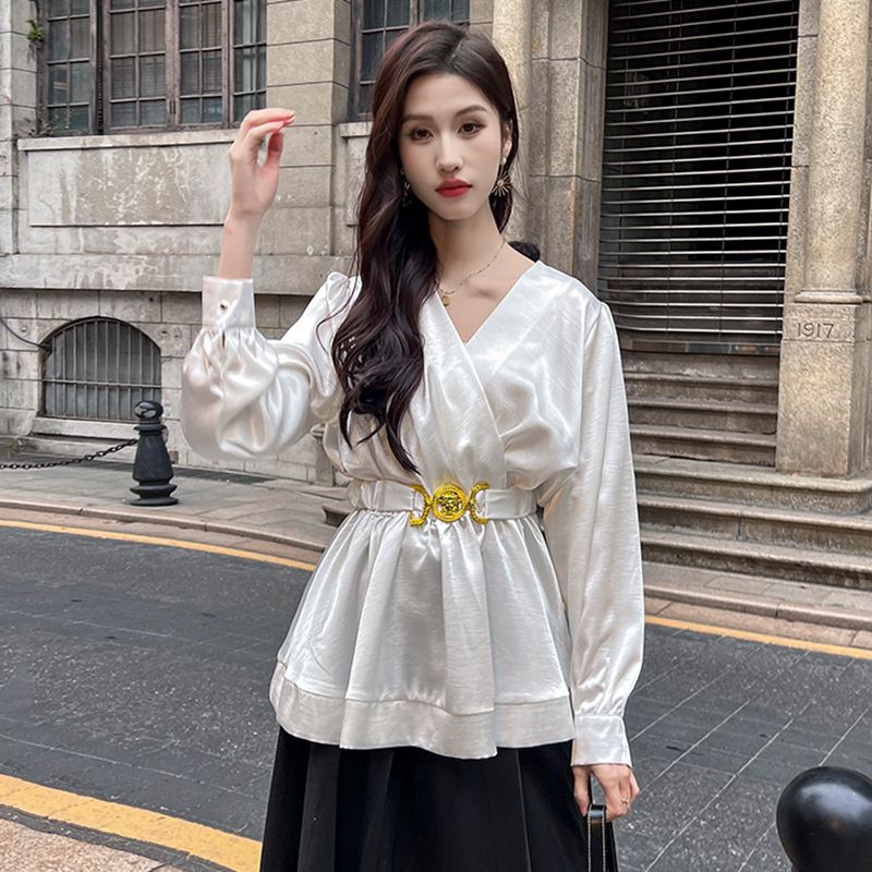 Elegant Pure Desire Ancora Red Satin Blouse with Belt Waist-Cinching French Light Lady Acetate Shirt