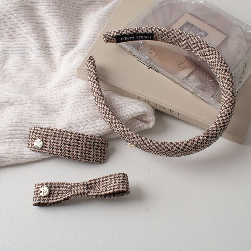 Elegant Houndstooth Headband for Women, High-End Coffee Color with Gold Label, Bowknot Duckbill Clip Hair Accessory
