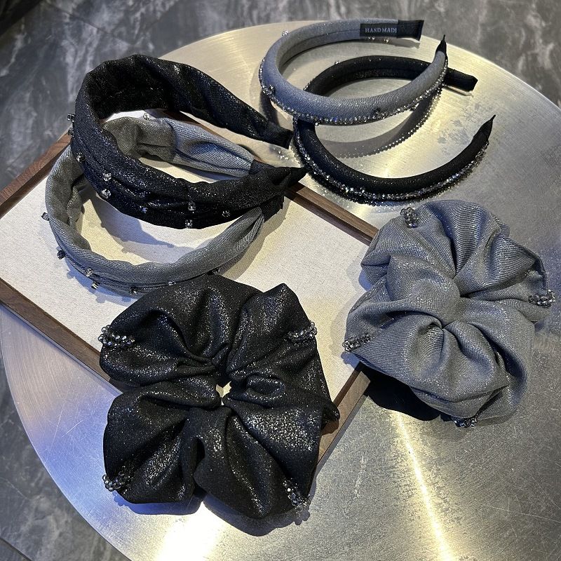 Gray Beaded Scrunchie Shiny Hairband Elegant Ruched Headband Graceful Hair Tie Hair Accessory for Women