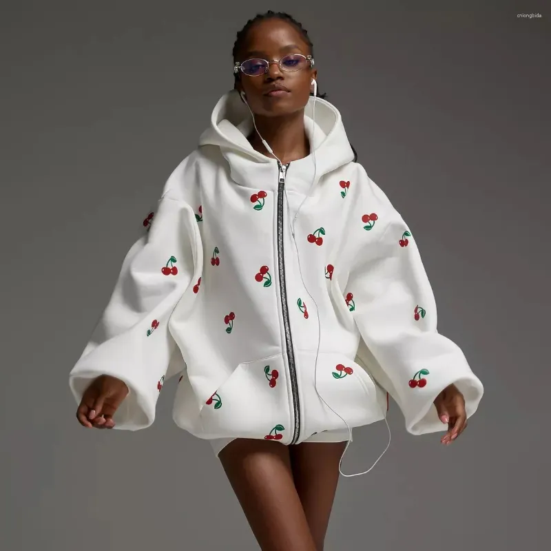 Eleganti e calde felpe con cerniera: felpa casual con stampa di ciliegie in misto cotone, vestibilità ampia e tasche