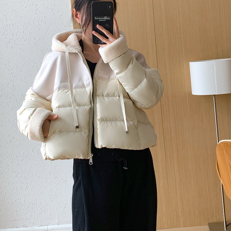 Giacca corta europea in piumino per donna stile corto cuciture colore a contrasto pelle PU leggera lusso alta qualità maglione largo 2024 nuovo inverno