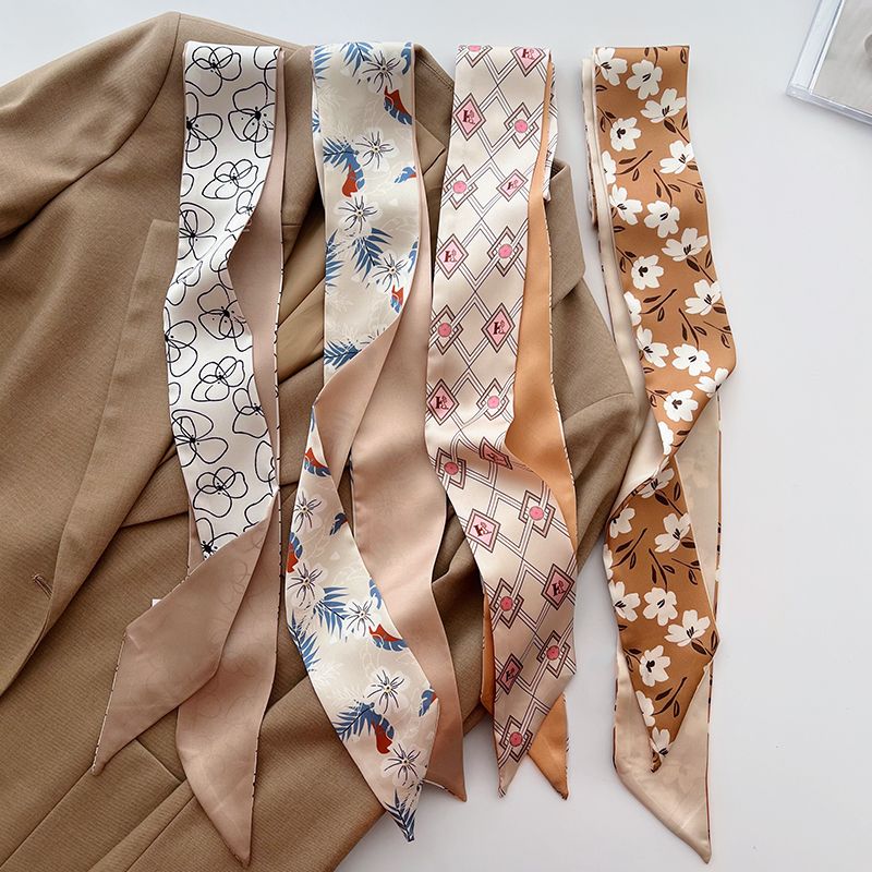 Khaki nude silk scarf printed small strip women's Korean version headband tied bag decoration ribbon shirt suit scarf