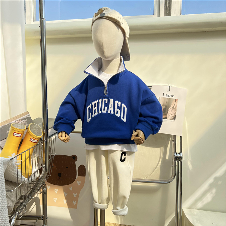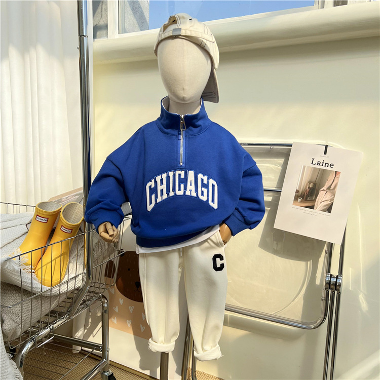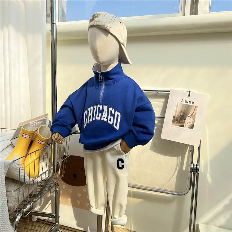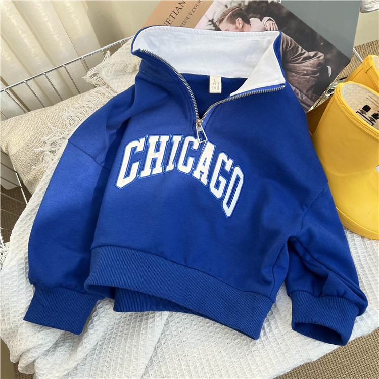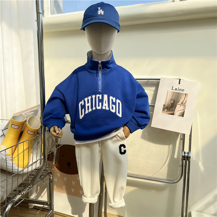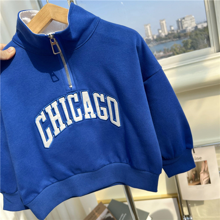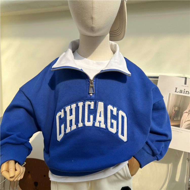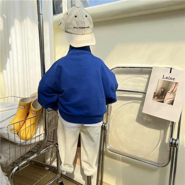 Felpa con cappuccio blu Klein a maniche lunghe con colletto rialzato e alfabeto ricamato per ragazzi coreani autunnali 2024