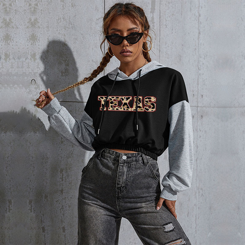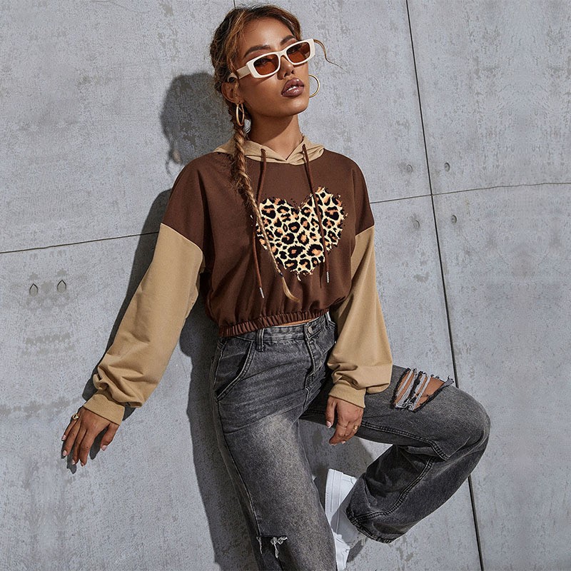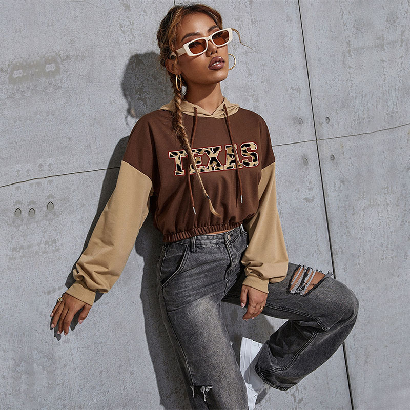 2023 New Autumn Short Printed Hoodie Casual Crop Top Patchwork Hooded Sweatshirt for Women