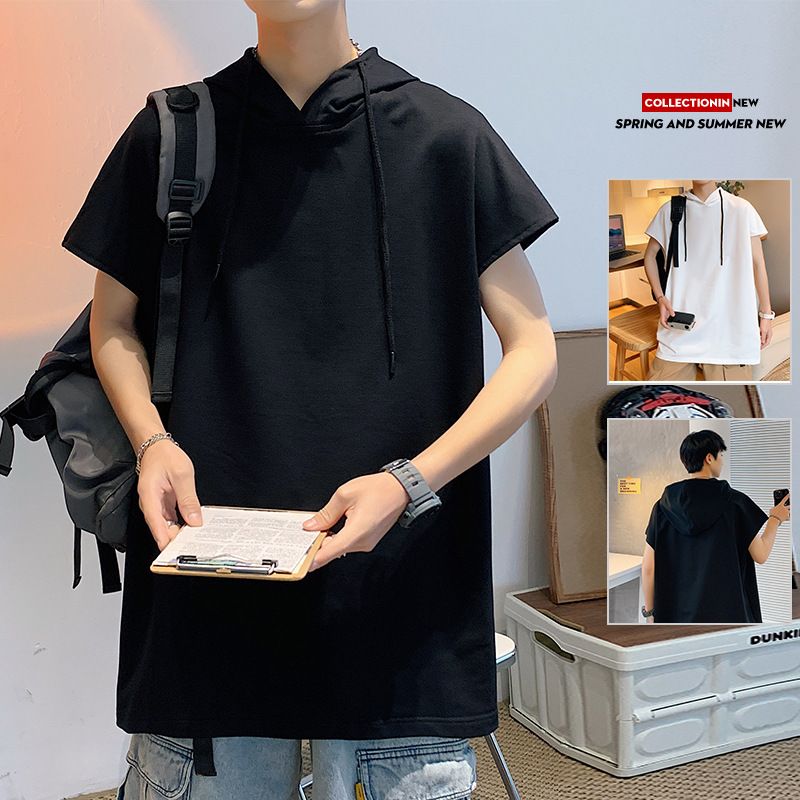 Felpa con cappuccio da uomo con cappuccio largo a maniche corte alla moda, marchio europeo Vsion, tinta unita, sportiva, felpa con cappuccio per giovani