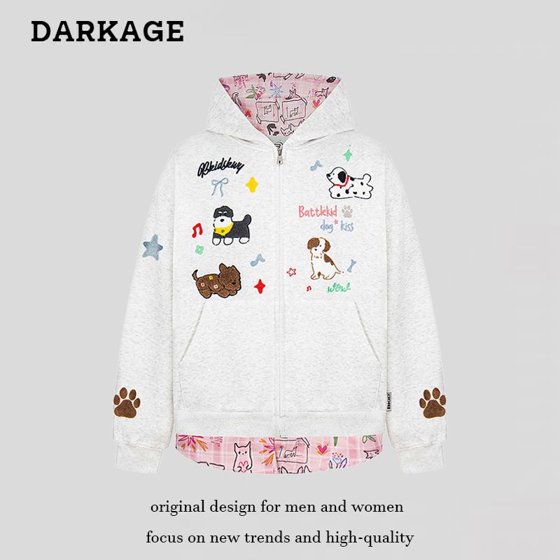 American Style Puppy Embroidery Patchwork Hooded Sweatshirt Cardigan for Men and Women 2025 Autumn Lazy Style Zipper Jacket
