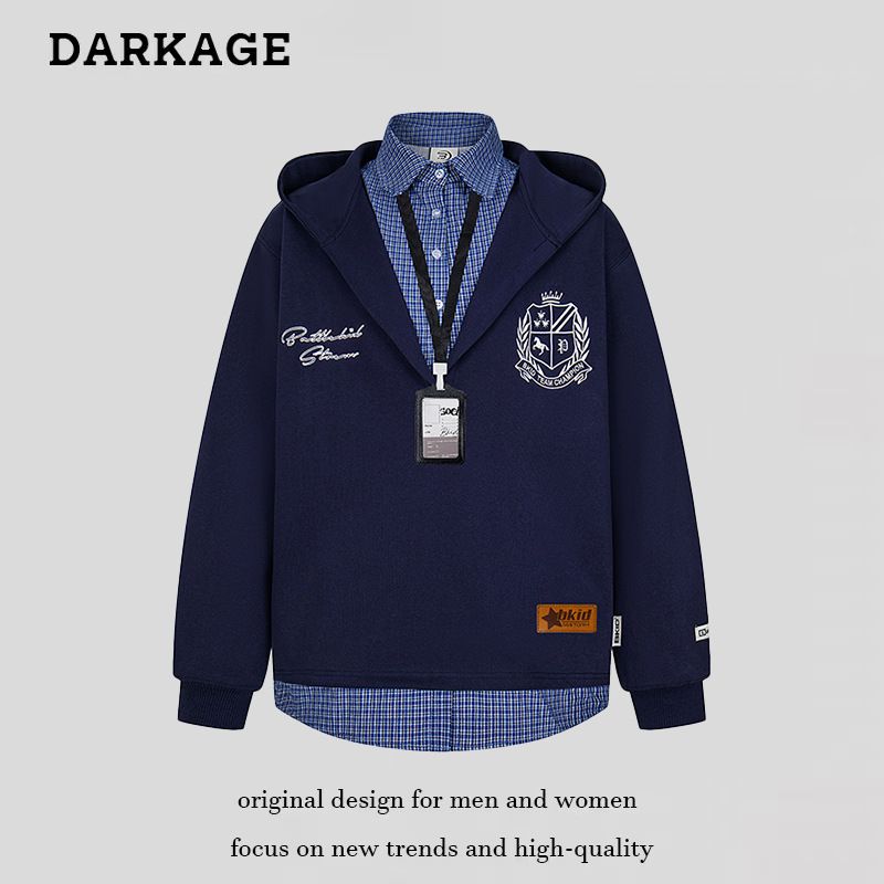 American Plaid Fake Two-Piece Shirt Patchwork Hooded Sweatshirt 2025 Unisex Autumn New College Style Jacket