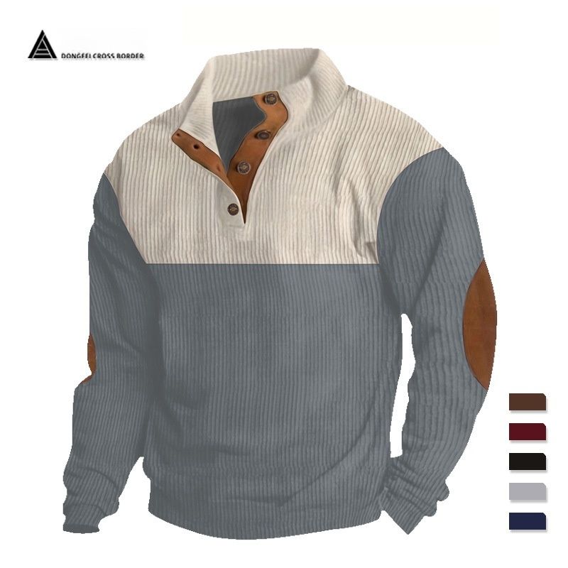 2025 plus size autumn and winter men's casual color blocked lapel sweatshirt, corduroy stand up collar top