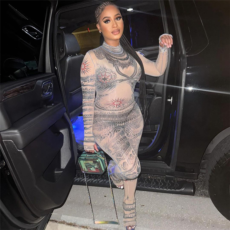 Feng 2024 Tuta da donna in corno aderente a vita alta con stampa a rete di nuova moda autunno 2024