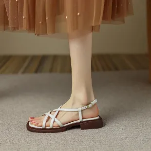 Scarpe casual estive da donna con punta aperta, marroni francesi, con fondo piatto e cinturino singolo da spiaggia, sottili strisce incrociate basse