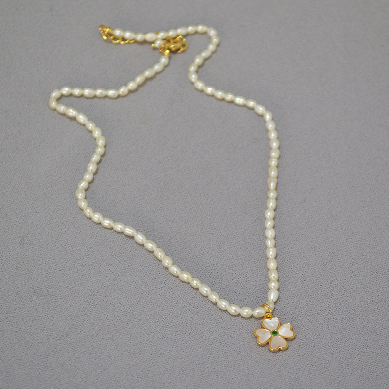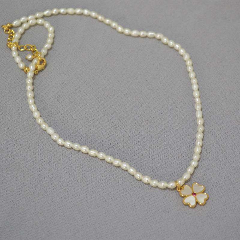 Collana in stile francese con quadrifoglio in perle d'acqua dolce intarsiate con ciondolo in madreperla colorata e catena per clavicola