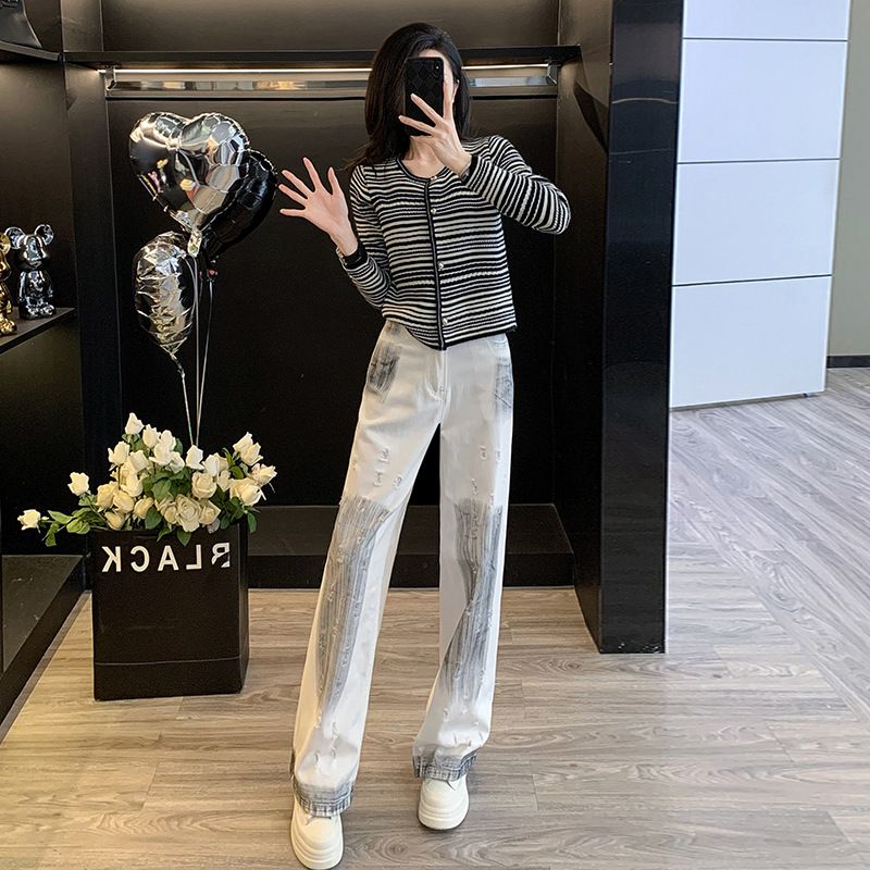 Giacca in maglia a righe in stile coreano per donna, primavera 2025, set di cardigan alla moda e pantaloni in denim