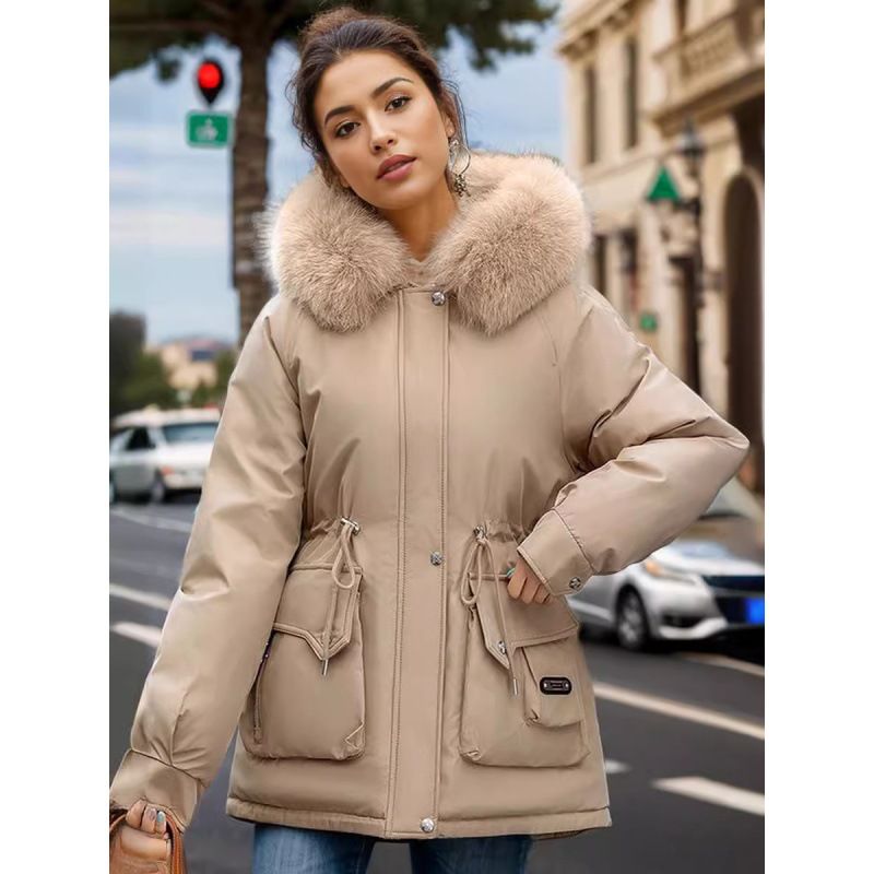 Giacca invernale da donna con cappuccio medio-lunga in cotone e lana di agnello, 2024, modello Foreign Trade Challenge