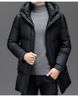 Giacca invernale nuova e spessa di media lunghezza per uomini di mezza età e giovani, caldo cappotto casual da uomo con cappuccio in piumino d'anatra bianco