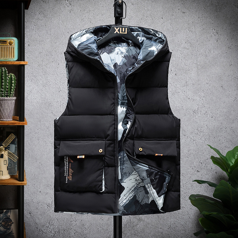 Down cotton vest for men's trendy autumn and winter warm vest, trendy casual and versatile, detachable hat for men's vest