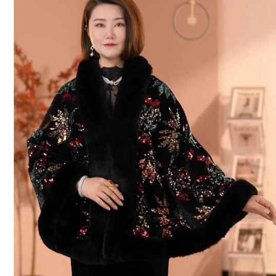 ragazza Ragazza 2023 Autunno Inverno Nuovo Cappotto con collo in pelliccia lavorato a maglia con paillettes, spesso e versatile, scialle in pelliccia