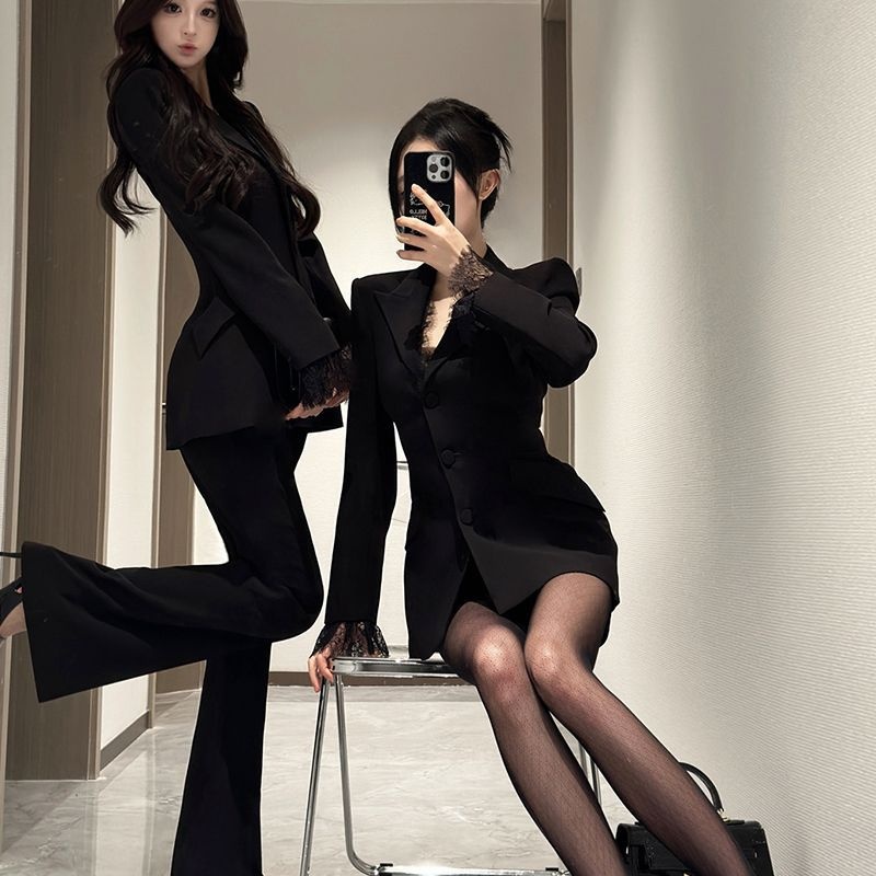 Completo da donna in due pezzi, elegante, casual, con pantaloni lunghi, in pizzo patchwork Manxuan, con maniche nere, autunno inverno