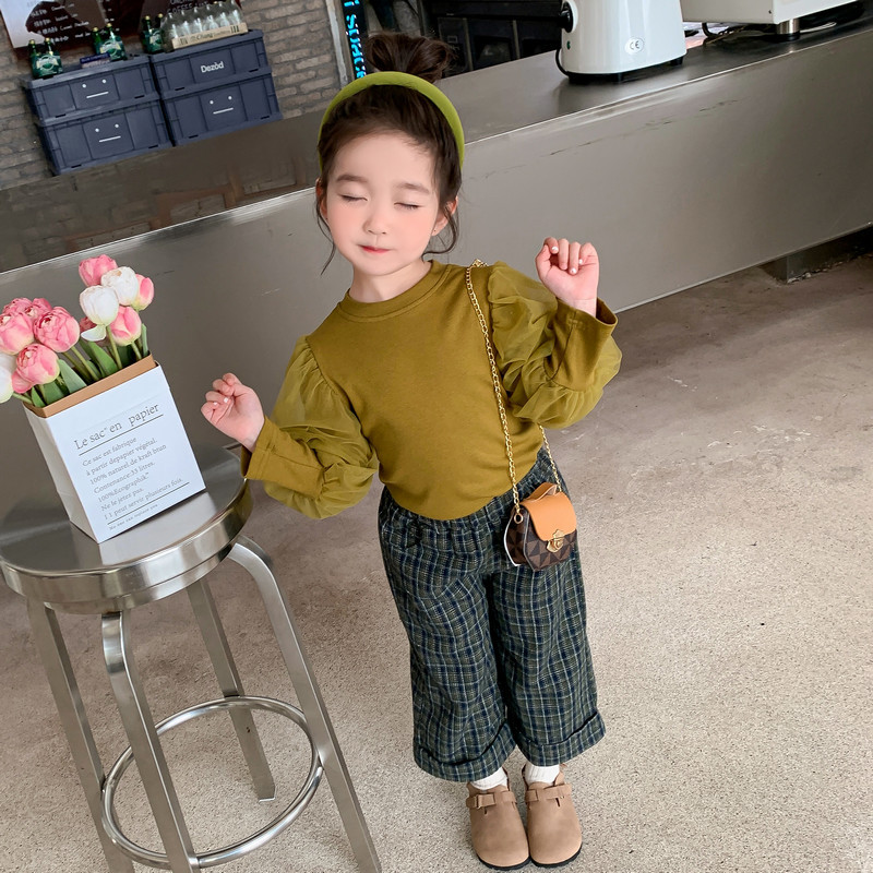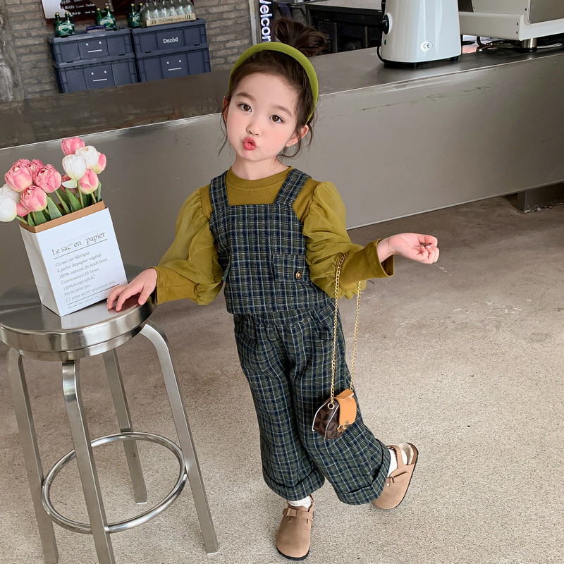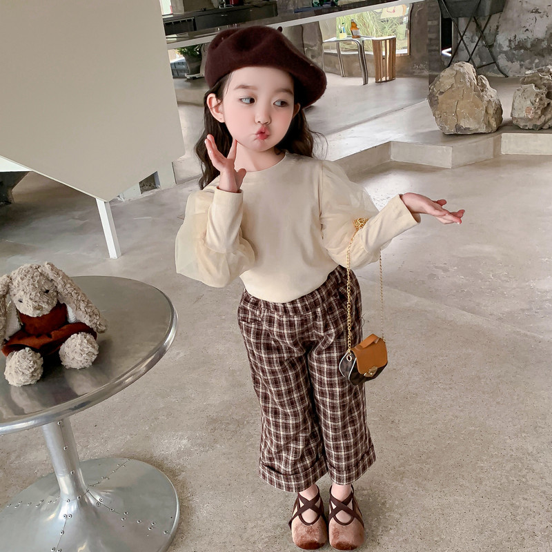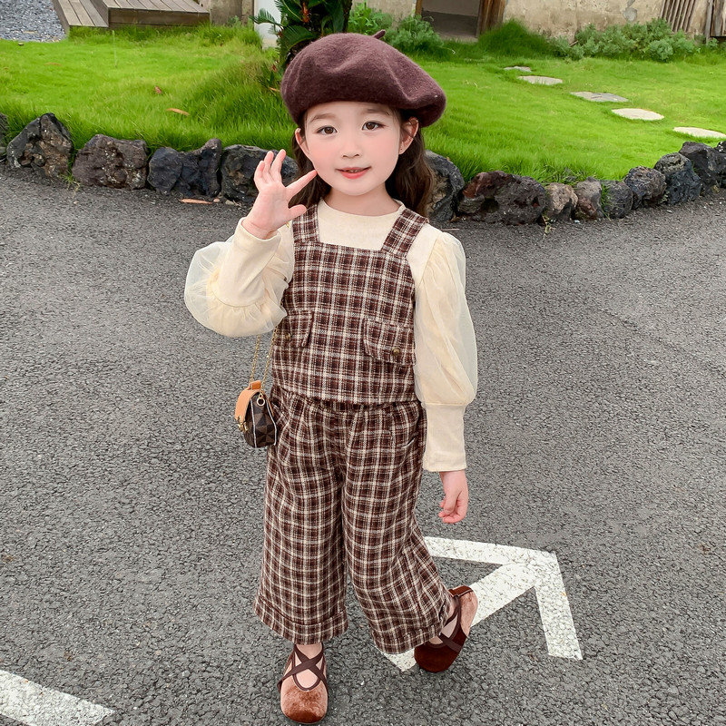 Girls' Autumn Set 2023 New Korean Underlay Wide Legged Pants British Style Plush Plaid Three Piece Set